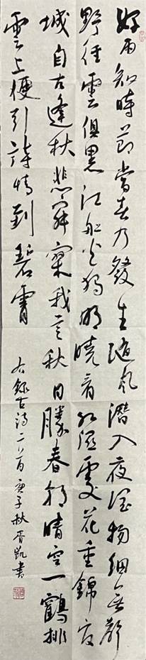 创作说明:行草作品,创作于2020年4月,庚子新至,本应万家灯火,又奈何天降大祸。抗疫战士响应党中央号召舍小家为大家,秉持人类命运共同体观念,合力抗疫,取得了武汉保卫战和湖北保卫战的决定性胜利。此作品多用米芾笔意,整饬且不失灵活,浓淡与粗细搭配有致符合创作主题。之所以选用行草而不是碑或者楷那样给人以''庄重''的字体,是因为想给观者传达一种从绝望看到希望,从短暂看到永恒的理念。
