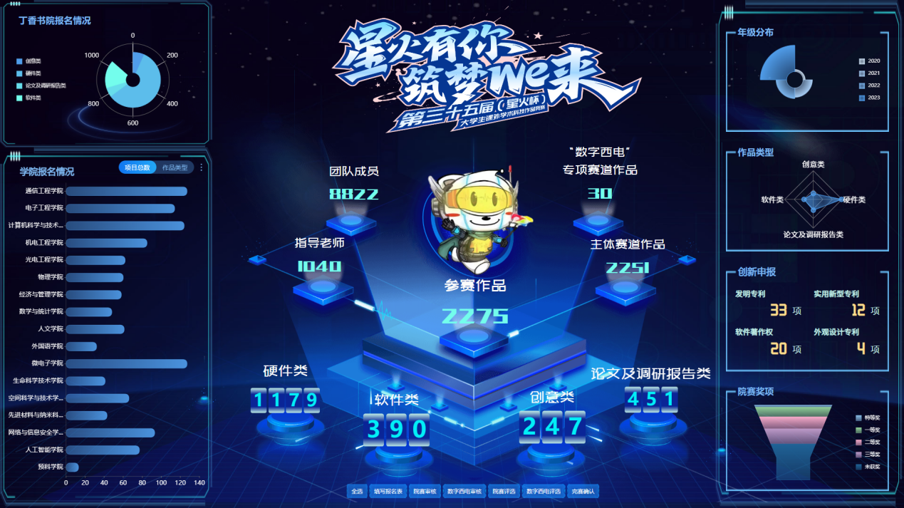 本次星火科创嘉年华采用数据驾驶舱可视化工具制作星火杯作品报名数据看板,对报名数据进行分类整合,以直观的图表、仪表盘对全校参赛作品进行可视化展示。